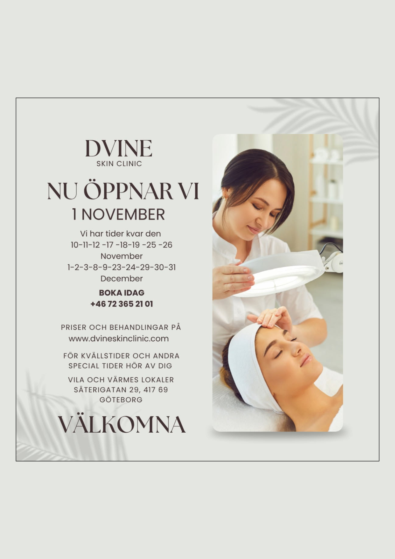 Dvine Skin Clinic flyttar in i vårt behandlingsrum och öppnar 1 november! Redan nu kan du boka in dig på lyxiga behandlingar med ekologisk hudvård. Dvine utför professionella behandlingar som verkligen levererar - inte bara en mysig stund, utan verklig hudförbättring.